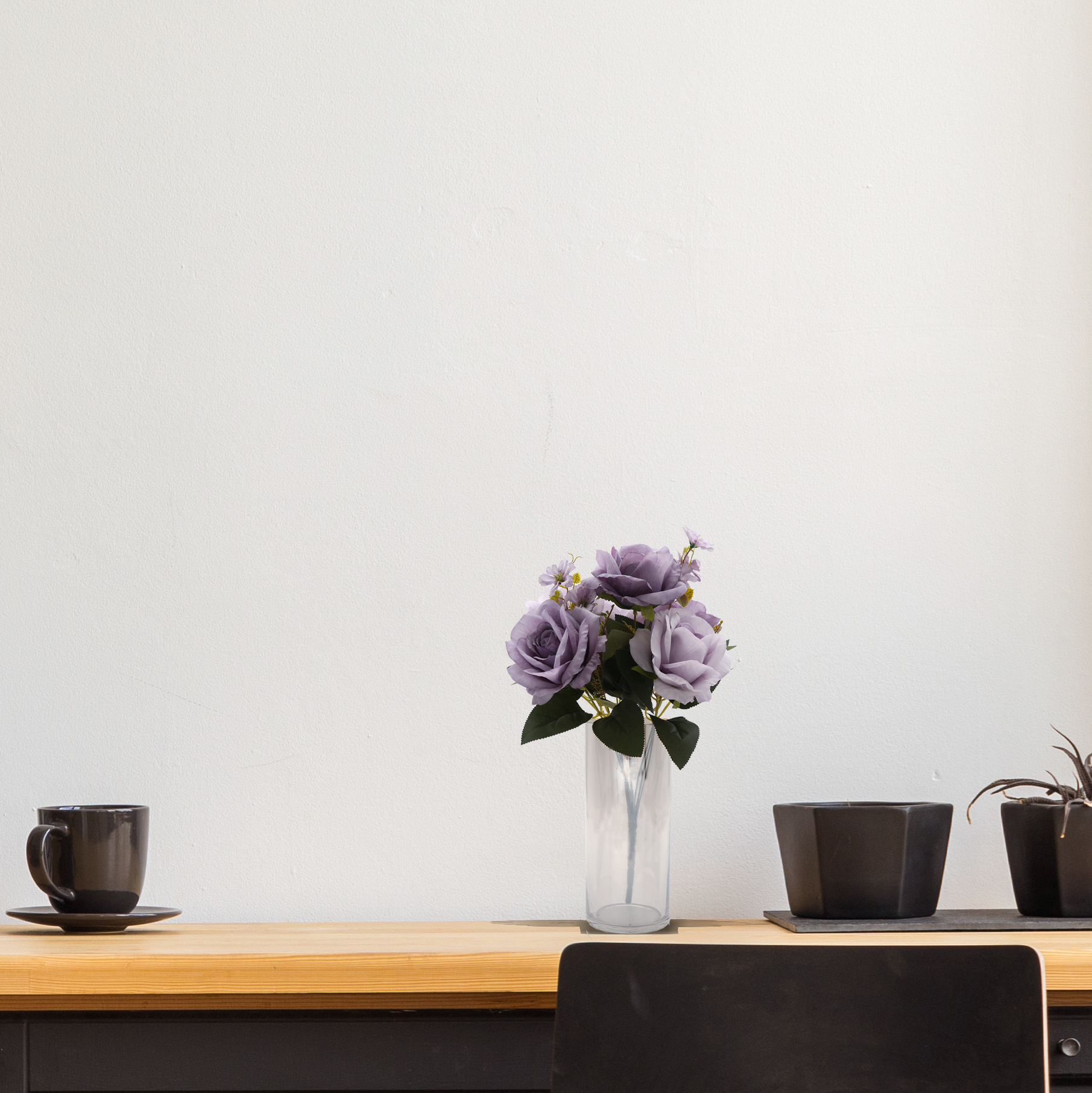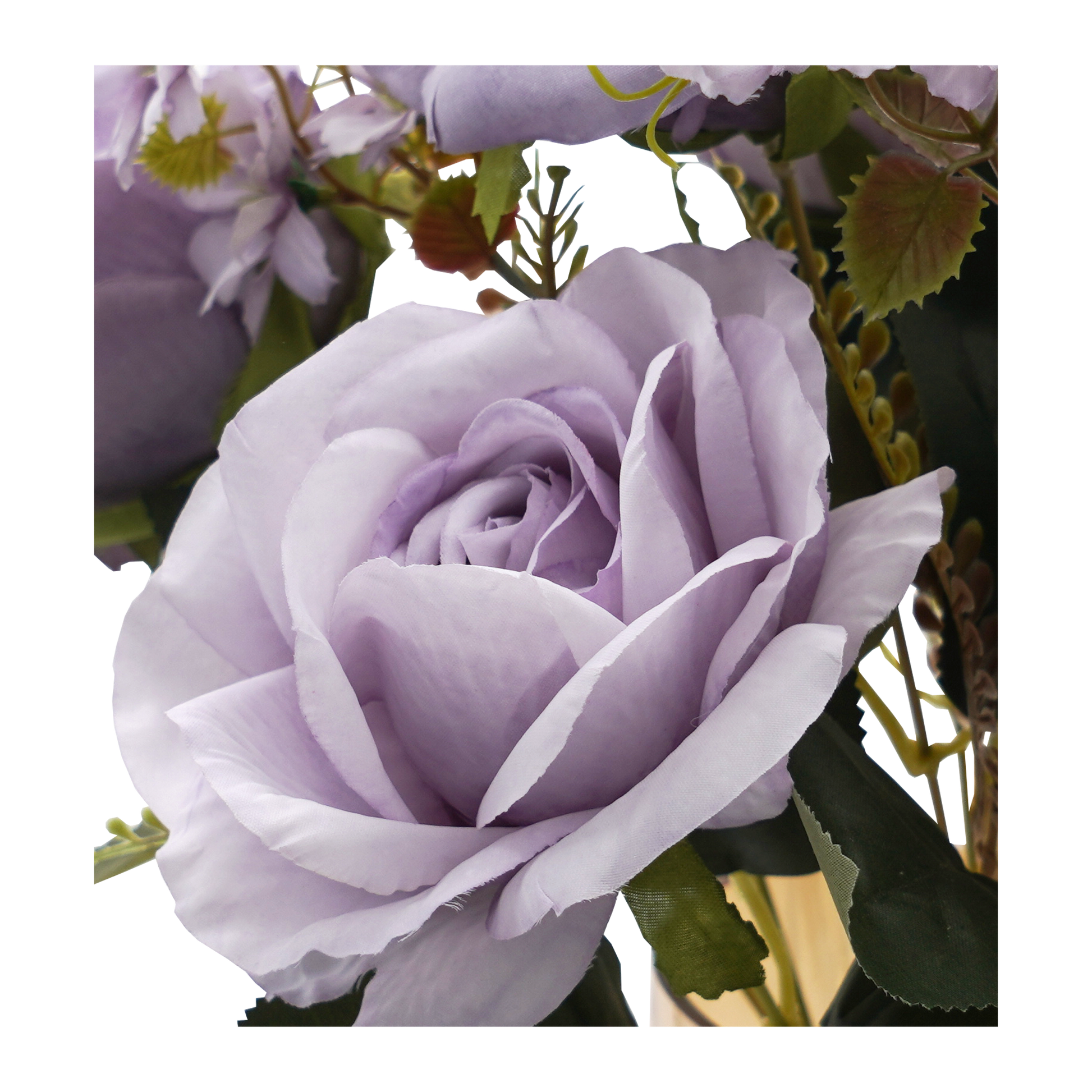This Artificial Stem is delicate and appealing with stems of lifelike rose in light purple. The flowers are nestled amongst lovingly textured leaves with vein detailing and small blueberry flowers. Furthermore, the flowers appear in various stages of blooming, which adds to visual interest.